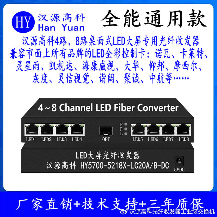 汉源高科8路LED显示屏专用光纤收发器的兼容性是其核心优势之一。它无缝兼容诺瓦、卡莱特、灵星雨、凯视达等主流品牌全彩LED控制卡,支持市面上所有品牌的LED全彩控制卡。这意味着无论体育场馆使用何种品牌的LED显示屏,都能通过这款设备实现高效控制,无需担心兼容性问题。