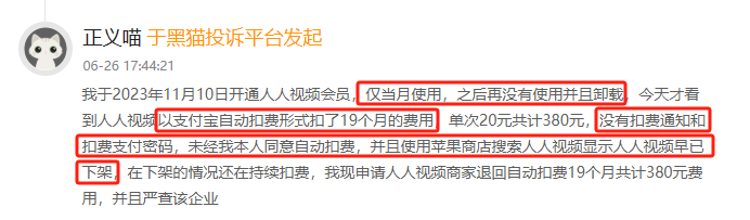 本月有消费者反映称,自己在2023年11月开通了人人视频会员,仅在当月使用,之后再没有使用并且卸载,近期却发现该应用以支付宝自动扣费的形式扣费长达19个月,期间未经自己同意,也没有任何扣费通知,并且在应用商店搜索人人视频显示早已下架。