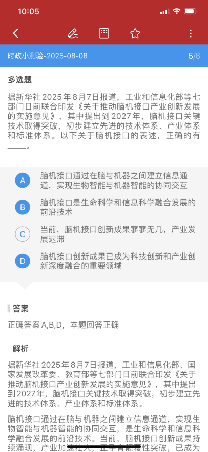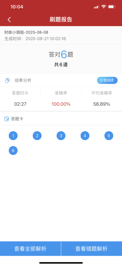每天6道题,一分钟就可以完成时政补充。答完可以看到正确率统计,不会的也别着急,后面还有详细的解析。