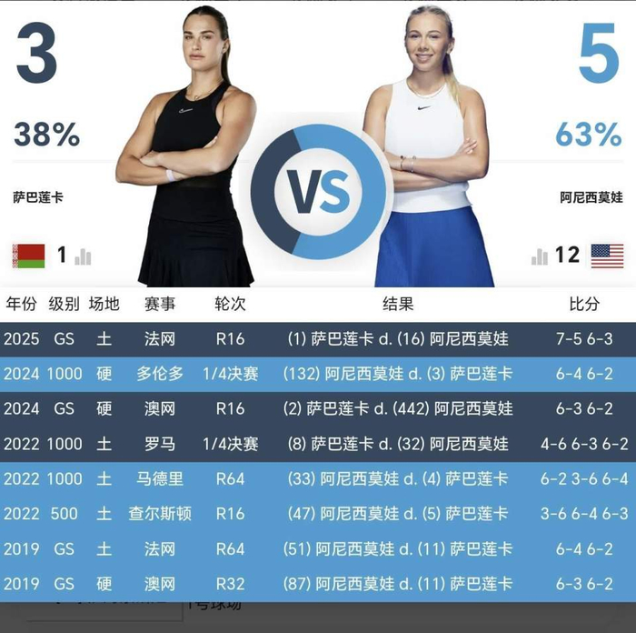 阿尼西莫娃真的成长了很多,火力输出很猛。美网决赛是她跟萨巴伦卡的第10次交手,前9次交手萨巴伦卡只赢过3次。温网半决赛,萨巴伦卡是1-2被阿尼西莫娃淘汰的。两人都是力量型球员,都是暴力抽击型打法,都得看现场状态和情绪。非受迫失误、体能以及主场观众,很可能是决定本届美网女服务员单决赛的胜负手,谁能解决好这三者的关系,也许谁就是冠军。