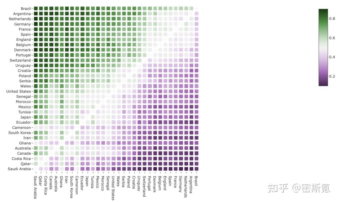 图|每个可能的对抗球队组合,一支球队在淘汰赛中击败另一支球队的概率(绿色和紫色分别表示概率高于和低于 50%)。
