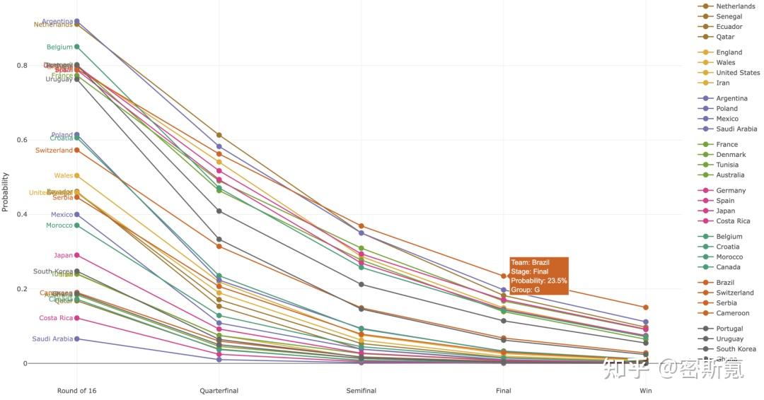 图|各支球队进入十六强赛、八强赛、半决赛、决赛和夺冠的概率。